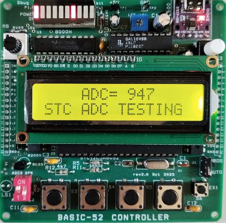 The new design BASIC52 controller is built with STC12C5A60S2, single-cycle 8051 compatible chip and a 32kB Ferro-electric memory. The controller board has preloaded the BASIC-52 interpreter with add-on functions for full access of STC's special function registers. The kit has an extra input port and output port, an RV09 pot for 0-5V analog test signal, a 10-bit bar display, and an optional text LCD port. The BASIC program can run with simple mode switch, when set to AUTO the program will start run after power on easily.