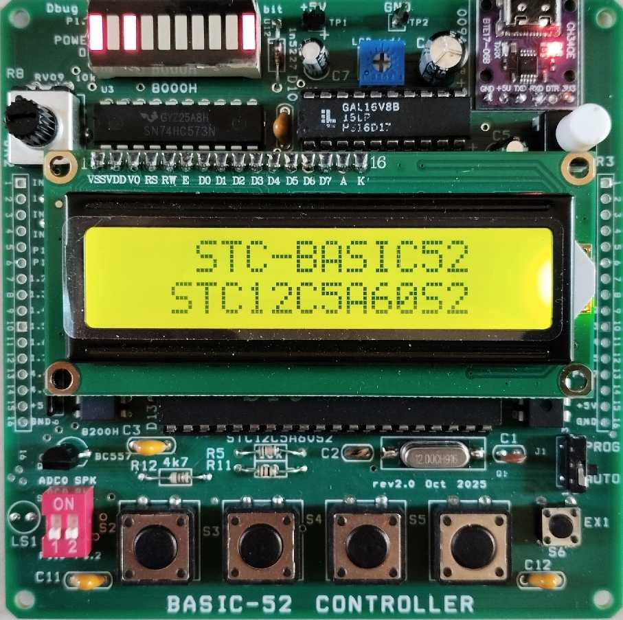 New design BASIC52 controller using STC12C5A60S2 single cycle 8051 compatible microcontroller and Ferro-electric memory. Available now, latest BASIC52 with LCD driver.